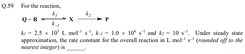 Q.48 The dissociation constant of a weak monoprotic acid is 1.6 x 10−5 and its molar conductance at infinite dilution is 360.5 x 10−4 mho m2 mol−1. For 0.01 M solution of this acid, the specific conductance is n x 10−2 mho m−1. The value of n (rounded off to two decimal places) is ______.